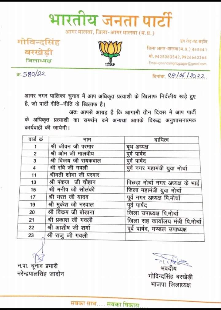 भाजपा,जिलाध्यक्ष,गोविन्दसिंह,बरखेडी, ने,पार्टी,प्रत्याशियों,के विरुद्ध ,चुनाव,लड़ने वाले पार्टी कार्यकर्ता,स्वयं को 6 साल के