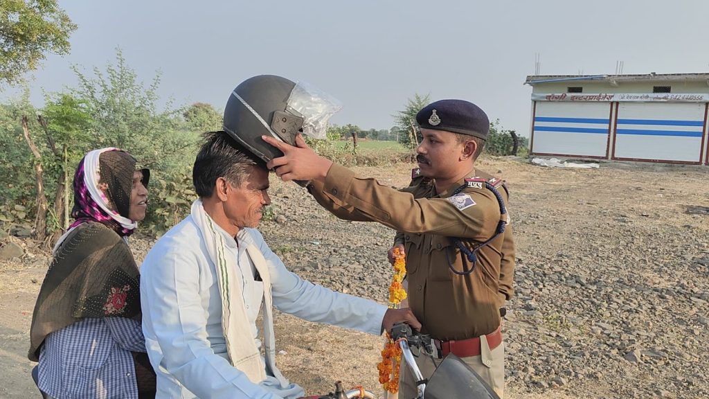 यातायात,जागरूकता,अभियान के दौरान थाना यातायात,ब्यावरा, द्वारा हेलमेट पहनकर चलने वालों को फूलमाला पहना कर स्वागत किया गया और समझाईश दी गई,